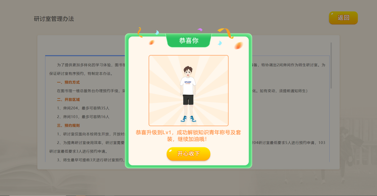 3.点击学习按钮开始图书馆的学习啦,每学习完一个章节会解锁一个游戏关卡,学习和闯关都会获得相应的布可币和经验值。闯关游戏中会有试题的出现,请同学们认真作答,答对的题目越多获得的布可币就会越多哦~