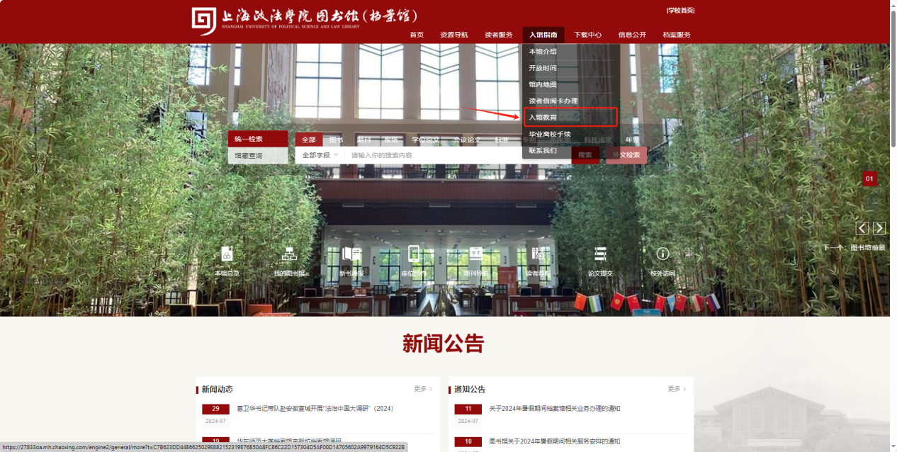 2.图书馆主页导航栏→入馆指南→入馆教育。