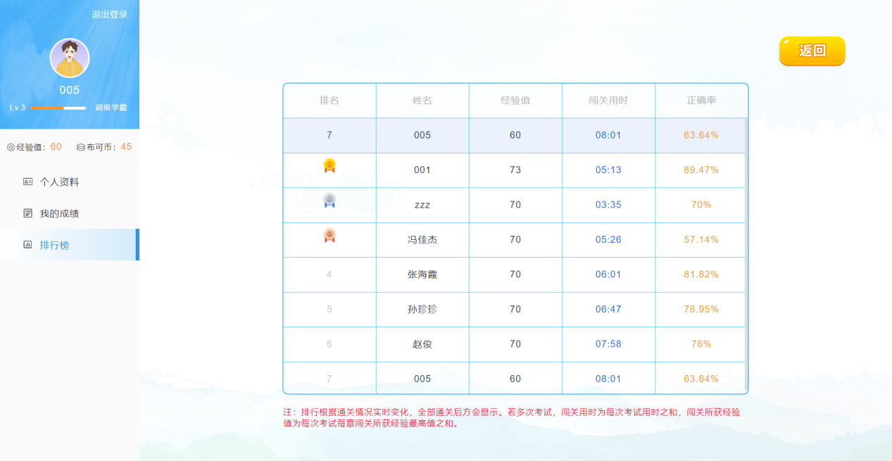 5.所有的学习和闯关都完成后,可以在个人中心查看个人成绩和排名,查看经验值和布可币的获取情况,答题详情也会在这里展示哦~