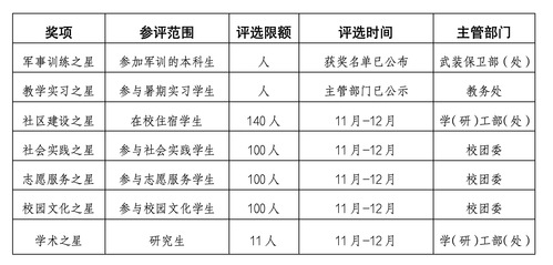 (四)校级审议:学(研)工部(处)学生资助奖励中心汇总后行文报告,提交给校学生工作指导委员会审议,审批通过后,校内公示5天;公示无异议后,授予荣誉称号。