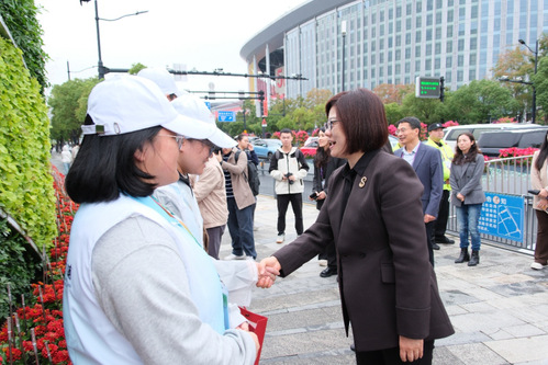 11月7日下午,校党委书记葛卫华,党委副书记、校长刘晓红,党委副书记、副校长高志刚一行来到国家会展中心,亲切看望慰问正在馆内外一线服务的上政“小叶子”。青浦区委副书记刘琪,上海市公安局青浦分局党委副书记、政委张益群,团市委挂职副书记唐志宇,及上海市政府办、上海市公安局青浦分局、青浦区委社会工作部、青浦区团委等相关单位、部门负责同志与校领导共同慰问,校内相关职能部门和二级学院有关负责人参加了慰问活动。