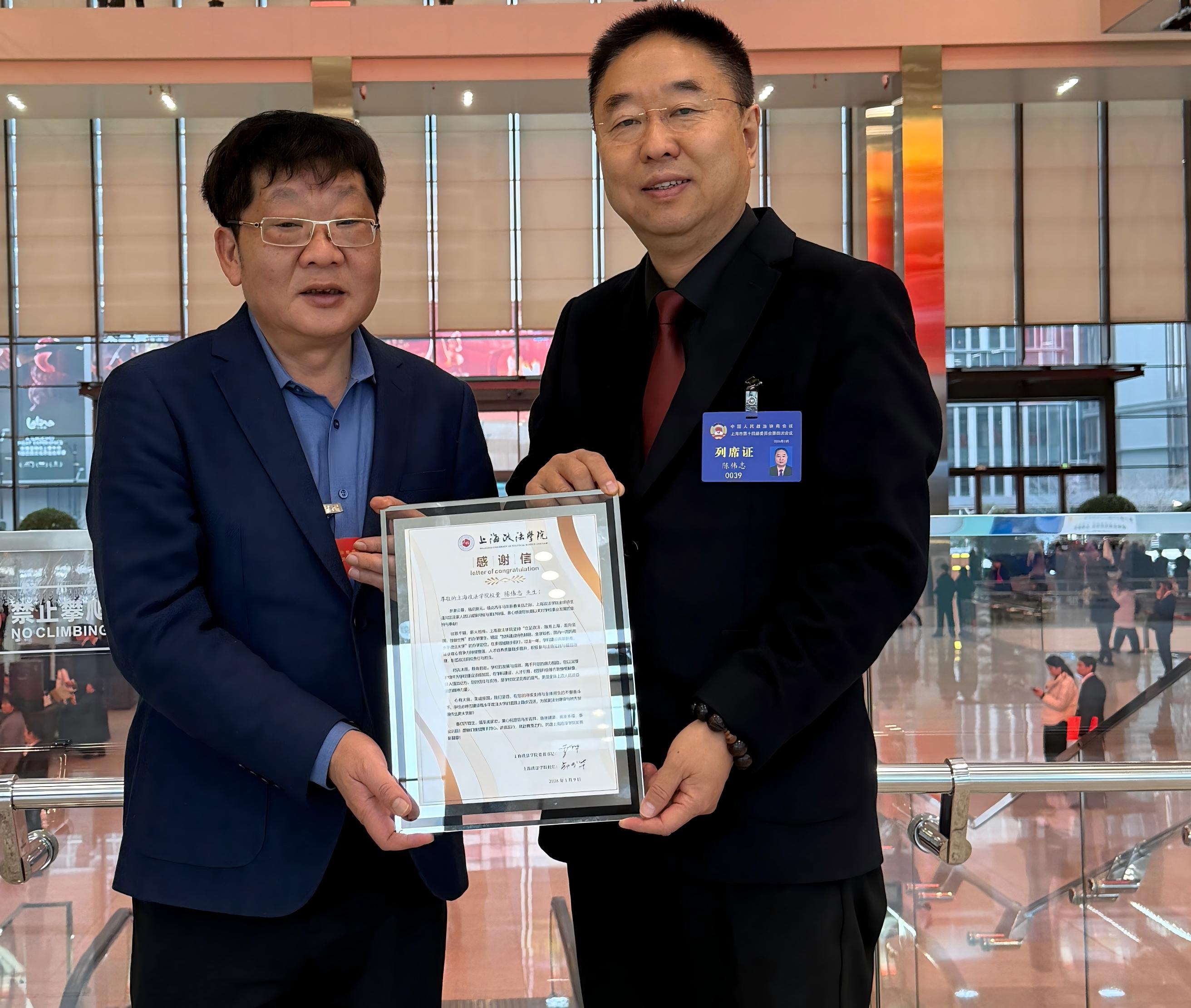 会面中,各方首先围绕市高级人民法院、市人民检察院工作报告展开深度交流,一致认为两份报告紧扣上海城市发展定位,将司法工作与“五个中心”能级提升、高水平改革开放、现代化城市治理等重点任务深度融合,既展现了2025年上海司法机关在案件审理、检察监督、司法改革等方面的亮眼成效,也明确了2026年服务上海“十五五”规划、优化法治化营商环境、打造专业化司法人才队伍的核心方向。针对报告中提出的“更好支撑和服务‘五个中心’建设”“为上海加快建成具有世界影响力的社会主义现代化国际大都市提供司法服务保障”等要求,郑少华表示,上海作为对外开放前沿阵地,司法实践对高素质涉外法治人才的需求日益迫切,这既为新时代法治教育高质量发展指明了前进方向,也对深化政校企协同育人、推动产教融合提出了更高标准、更实要求。交流中,郑少华代表学校对校董章毅、陈伟志长期以来关心支持学校建设发展、倾力赋能涉外法治人才培养表示衷心感谢。他还强调,学校将紧紧依托市两会精神与司法工作部署,进一步锚定服务国家涉外法治战略和上海城市发展需求,不断完善协同育人机制,着力培养政治过硬、专业精湛、通晓国际规则、具备国际视野的高素质涉外法治人才,为上海法治建设和城市现代化发展贡献更大力量。