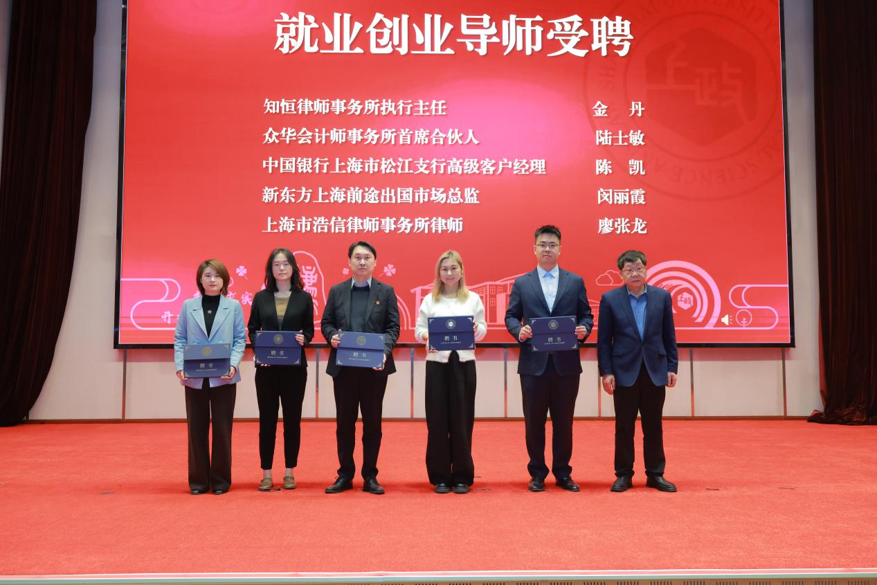 校长郑少华为知恒律师事务所执行主任金丹、众华会计师事务所首席合伙人陆士敏、中国银行上海市松江支行高级客户经理陈凯、新东方上海前途出国市场总监闵丽霞、上海市浩信律师事务所律师廖张龙等五位行业专家颁发了就业创业导师聘书。