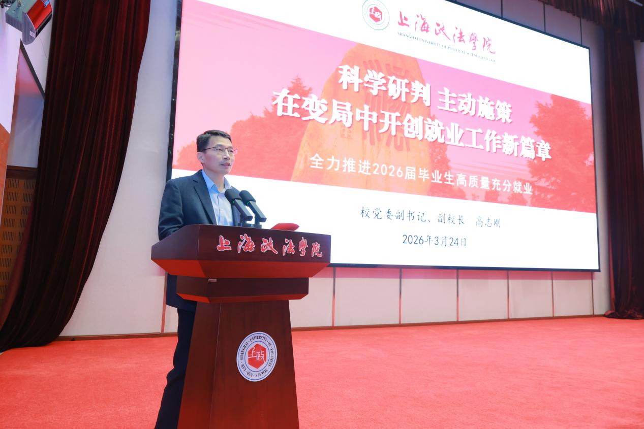 3月24日下午,我校2026届毕业生就业工作推进会在中国—上海合作组织国际司法交流合作培训基地207会议室召开。校党委书记葛卫华出席会议并讲话,校长郑少华出席会议并为新任就业创业导师颁发聘书。会议旨在深入贯彻落实党中央、国务院及上海市委、市政府关于高校毕业生就业工作的决策部署,分析形势、明确任务、凝聚合力,全力推动2026届毕业生高质量充分就业,为学校“十五五”事业发展开好局、起好步奠定坚实基础。校领导、二级学院党政班子成员、职能部门负责人、全体辅导员、企业代表以及就业创业导师代表参加会议。党委常委、副校长罗立刚主持会议。