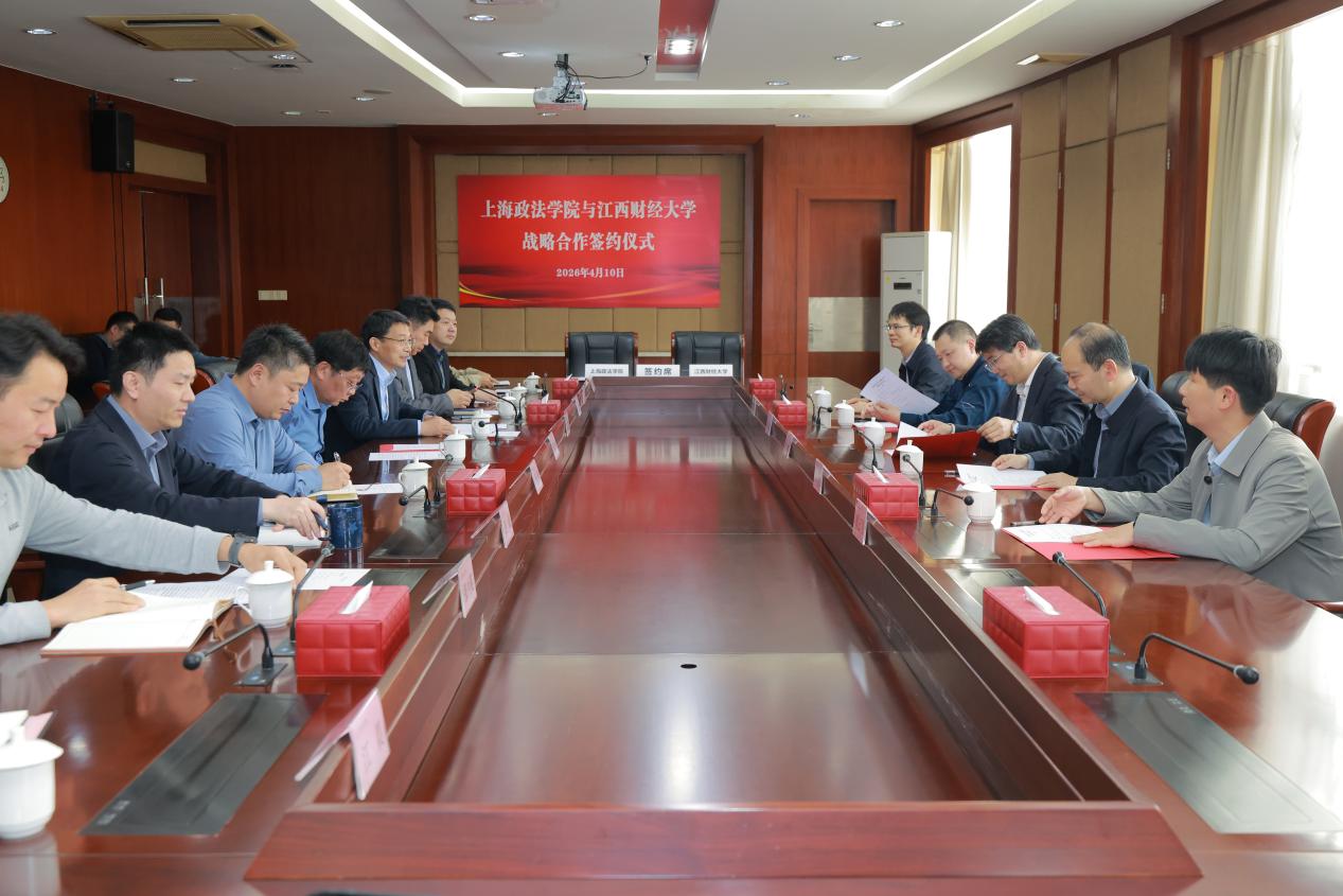 4月10日下午,上海政法学院与江西财经大学战略合作签约仪式在我校求实楼413会议室举行。上海政法学院校长郑少华,江西财经大学校长邓辉,党委常委、副校长李春根出席签约仪式。上海政法学院党委副书记、副校长高志刚主持会议。