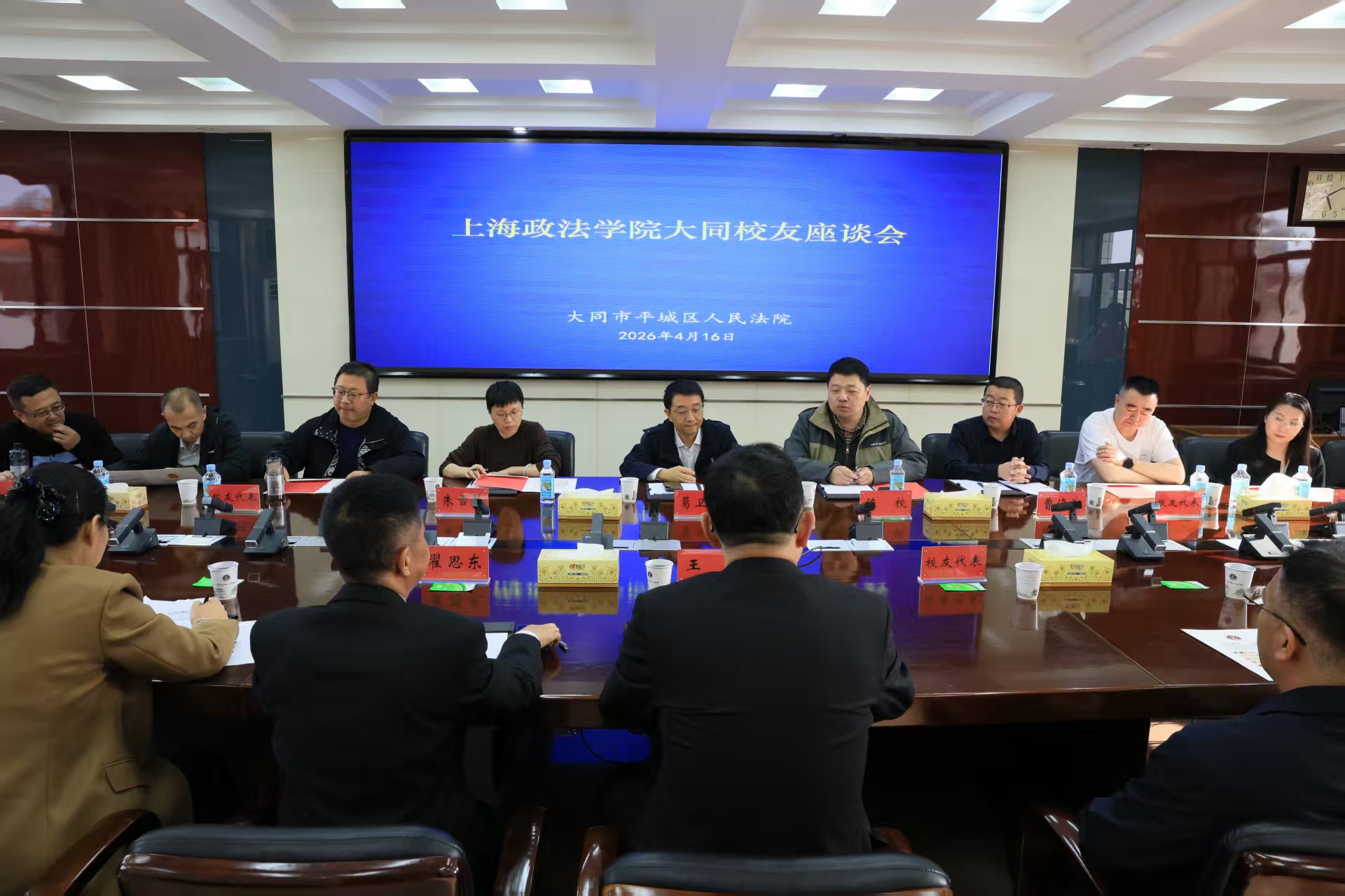 4月16日下午,葛卫华书记走访大同市委政法委及平城区委政法委,参观平城区人民法院调解中心,了解一站式多元解纷、诉讼服务体系建设及矛盾源头治理成效。大同市委政法委副书记乔来福,平城区委常委、政法委书记王兴,我校1993级校友、浑源县副县长贾雪花,1993级校友、平城区委政法委常务副书记曹海翔,平城区人民法院党组书记、院长王东等陪同调研并参加政法单位调研座谈会、大同市校友座谈会。座谈会上,我校1993级校友、新旺人民法庭副庭长高秀珍,1993级校友、全国模范人民调解员、永泰司法所所长李华,1993级校友、新荣区公安分局副局长武泽峰等校友,结合岗位分享一线基层治理、法治工作经验。双方围绕基层法治实践痛点、学生实习实训、基层法治人才需求等深入沟通,就强化理论实务衔接、提升人才培养适配性达成共识。大同市近30名校友代表参会,共话母校发展、共促基层法治建设。