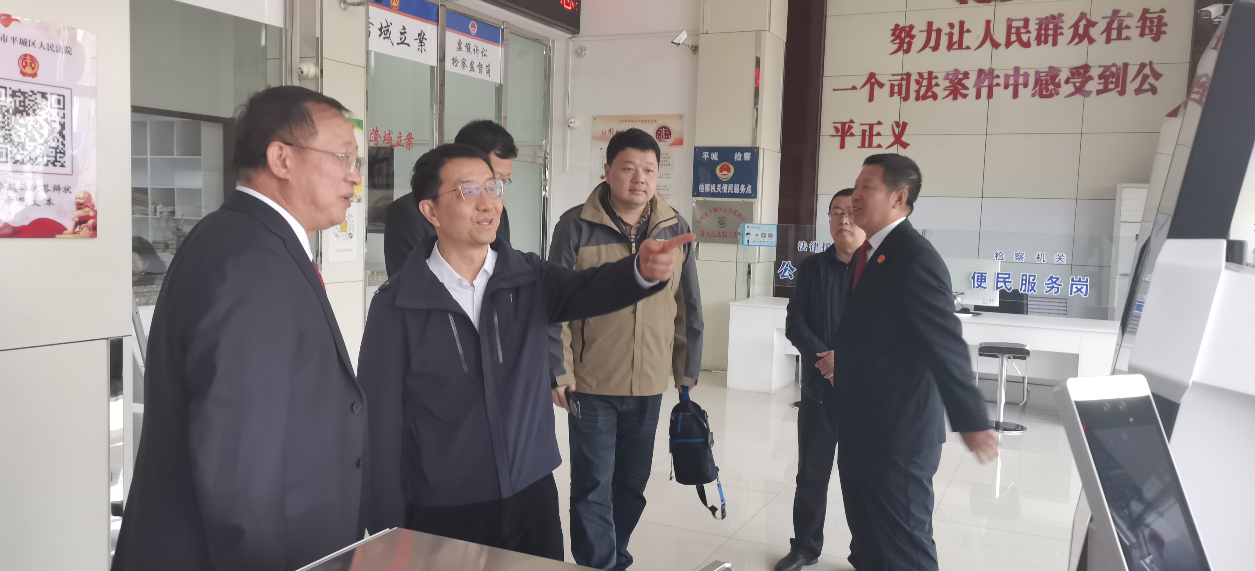 在天镇县公安局及玉泉派出所,天镇县县委书记梁军、县长闫伟国、县委副书记吴胜,我校1993级校友、大同市公安局政治部副主任张玺,1993级校友、天镇县政府副县长、公安局党委书记、局长康永兵陪同调研。调研组实地察看基层警务运行、矛盾纠纷排查化解、社会治安综合治理等重点工作,详细了解玉泉派出所身份证无人全自动办理等智慧便民服务新举措,充分肯定了基层公安以科技赋能法治建设、高效打通服务群众“最后一公里”的创新实践。