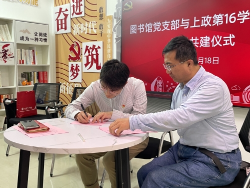 王伟向同学们介绍了图书馆党支部的支部特色及相关平台,具体阐述了党支部结对共建将带来的诸多积极效应。国际法学院党总支书记陈娜表示,支部结对共建为国际法学院学生加强与图书馆支部老师们学习提供了机会今后将切实加强支部之间的联系通过活动双方党支部加深对彼此的了解。之后图书馆党支部书记王伟与上政第16学生党支部书记徐炜鑫分别在支部共同签署共建协议