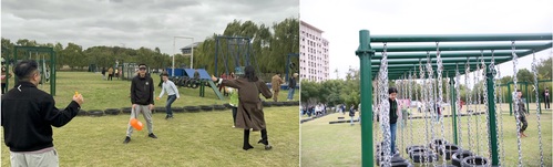 在国防教育园的“法韵青春,逐梦未来”趣味运动会上,校友们带着欢声笑语,共同重温那段似水年华。在“你画我猜”的游戏中,他们心有灵犀,用夸张的肢体语言和妙趣横生的解说,轻松破解了一张张成语卡片,赢得了现场观众的阵阵喝彩。“蒙眼打人”游戏更是将欢乐推向高潮,蒙眼的校友手持气锤,听声辨位,攻防之间,笑语欢声,场面热闹非凡。更温馨的是,“政二代们”也加入了各色国防活动项目,与父母一同体验转轮、攀爬、走轮胎、划铁索。传承在此刻具象,幸福在呐喊中开花。