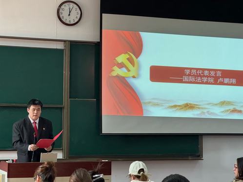 学员代表卢鹏翔同学进行发言,他汇报了预备党员们对于理论学习、爱党爱国爱校统一重要性的清晰认识,并代表全体成员作出承诺:将严格遵守培训班纪律,按时出勤、专心听讲、认真思考,坚持理论联系实际,加强团队协作,通过研讨交流分享学习收获,坚决以饱满热情、严谨态度投身培训。