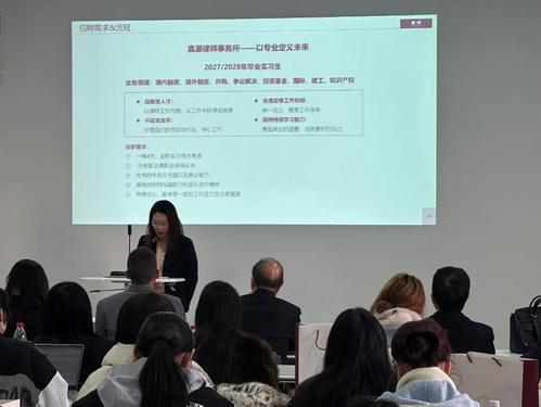 活动伊始,嘉源律师事务所合伙人陈启明律师系统展示了律所核心实力与发展格局:作为中国金融市场法律服务领军机构,嘉源在企业改制、股票发行、并购重组等传统优势领域积淀深厚,更在资产证券化(ABS)、不动产投资信托基金(REITs)等创新业务中稳居行业前列,每年协助客户融资规模超千亿元并持续增长。依托 “十国十一地” 的全球服务网络与全所一体化的公司化管理模式,律所能够为客户提供专业化、精细化的一站式法律服务,让在场同学直观领略到顶尖律所的专业底蕴与国际化视野。