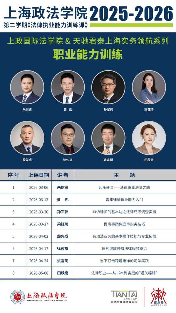 天驰君泰(上海)“律角兽”综合法律服务团队的上政行始于2023年贾琳副教授邀请贾宗达律师带队的5位律师在研究生《跨境并购经典案例研究》课程中分享的10次跨境并购实务讲座。至今,已经成功举办了三期。本次,还将有7 位具有丰富法律实务经验的律师,为同学们带来律师实务的饕餮盛宴。欢迎同学们踊跃参与。时间:周五3-4节,地点:主教202B教室。