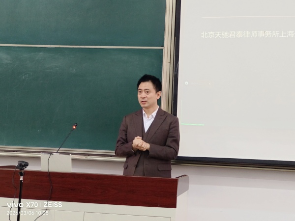 2026年3月6日,受上海政法学院国际法学院(国际仲裁学院)邀请,北京天驰君泰律师事务所上海分所朱尉贤律师,走进贾琳副教授开设的《法律职业能力训练》的课堂,为全体同学带来了北京天驰君泰律师事务所上海分所“律角兽”综合法律服务团队2026上政行的第一讲——《起承转合——法律职业进阶之路》。